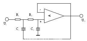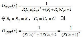 為了消除數(shù)字系統(tǒng)頻譜混疊,濾除高頻噪聲對控制系統(tǒng)的影響,故在數(shù)控系統(tǒng)的傳感器信號前端設(shè)計(jì)了二階低通抗混疊濾波器。抗混疊濾波器采用壓控電壓源二階低通濾波電路如圖5所示,其傳遞函數(shù)為: