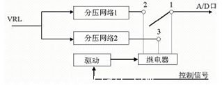 為提高測量精度,適應(yīng)更為廣泛的測量范圍,采用繼電器對分壓網(wǎng)絡(luò)進(jìn)行換檔。電路如圖8