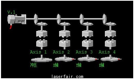 該系統由伺服沖壓機和配套的送料機所構成,沖壓機在沖壓完成的同時,送料系統進行送料的動作,在沖壓頭非工作的區域,完成送料,并且送料系統回到初始位置,等待沖壓機再次進行沖壓,依次循環,此系統要求送料系統動作和沖壓機的動作能相互配合,進行同步的控制。該設備需要沖壓軸一個,傳送軸六個。