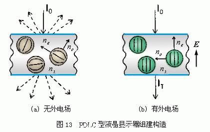 3. “高分子散布型液晶顯示器”(Polymer dispersed liquid crystal liquid crystal display),簡稱“PDLC型液晶顯示器”。這種顯示器的液晶組件構造如圖13所示。高分子的單體(monomer)與液晶混合后夾在兩片玻璃中間,做成一液晶盒。這種玻璃與上面所用的相同,是表面上先鍍有一層透明而導電的薄膜作電極。但是不需要在玻璃上鍍表面配向劑。此時將液晶盒放在紫外燈下照射使個單體連結成高分子聚合物。在高分子形成的同時,液晶與高分子分開而形成許多液晶小顆粒。這些小顆粒被高分子聚合物固定住。 當光照射在此液晶盒上,因折射率不同,而在顆粒表面處產生折射及反射。經過多次反射與折射,就產生了散射(scattering)。此液晶盒就像牛奶一樣呈現出不透明的乳白色。