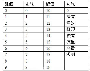 HD7279A的鍵值分布為:右邊數第一列為0-7,第二列為8-15,依次類推,本設計中由于共用到20個鍵,故使用了從右下角開始的S0-S1920個鍵,其鍵值與按鍵的對應關系如表1所示。