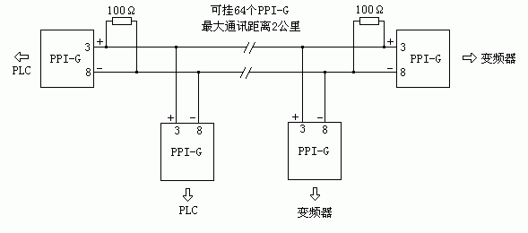解決以上問題的最簡單辦法是在PLC和變頻器的通訊口加光電隔離,如圖是采用德陽四星電子技術開發中心生產的PPI-G光隔離器組成的PLC和變頻器通訊網絡,由圖可見,所有設備均被隔離,整個通訊線路被浮空,有效的抑制了干擾的進入,也徹底解決了由于設備接地問題而引起的串擾,同時由于PPI-G產品本身的抗雷擊和延長通訊距離的功能,無疑會使系統的可靠性得到很大提高。