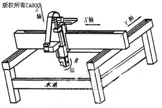 數(shù)控系統(tǒng)的機(jī)械本體采用龍門式結(jié)構(gòu)[3],共有四個傳動軸,分別為X軸、Y軸、Z軸和R軸。X軸、Y軸和Z軸通過伺服電機(jī)連接絲杠驅(qū)動,可以實(shí)現(xiàn)三軸聯(lián)動,其行程分別為800mm、600mm和400mm.。轉(zhuǎn)軸由伺服電機(jī)經(jīng)減速器減速來驅(qū)動,可連續(xù)運(yùn)動,承重10kg。工作臺面為一水池,水作為沖擊強(qiáng)化的約束介質(zhì)。在實(shí)際工作中,可以利用轉(zhuǎn)臺裝夾工件(如葉片)通過工作臺運(yùn)動實(shí)現(xiàn)不同部位的強(qiáng)化,也可以通過運(yùn)動軸上的反射鏡實(shí)現(xiàn)光斑的移動,從而實(shí)現(xiàn)雙工作方式。