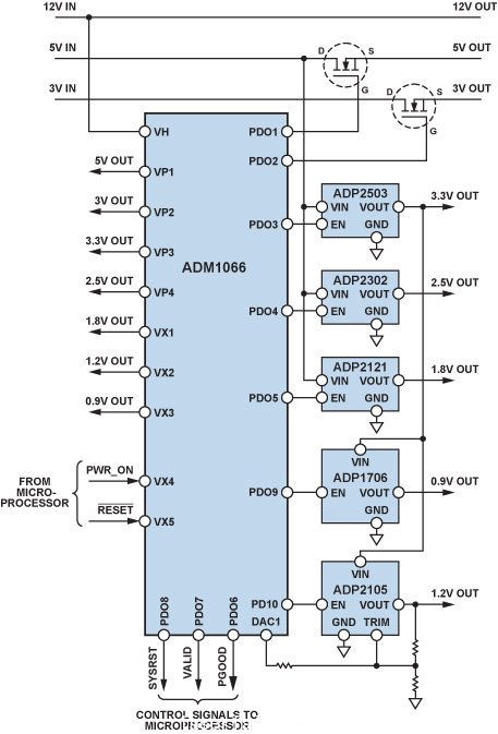 8軌系統具有三個主電源軌:12 V、5 V和3 V。其它電源軌則是利用開關調節器和LDO從這些主電源軌產生。每個調節器具有一路使能輸入,它由ADM1066的10路可編程驅動器(PD)輸出之一驅動,因此用戶可以按照一定的受控順序使所有電源軌上電。ADM1066具有一個片上電荷泵,可以提升6路PD輸出電壓以提供外部N-MOSFET的高驅動電壓;當需要控制更高電壓的電源時,外部N-MOSFET用作電源軌開關。