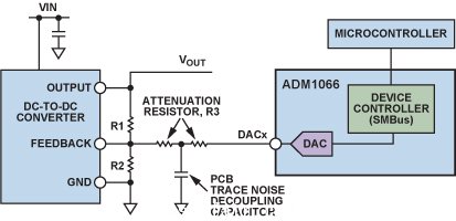 ADM1066最多可以為6個電源執行開環余量微調,它利用6個片上電壓輸出DAC(DAC1至DAC6)驅動要微調的電源模塊的反饋引腳。實現這一功能的最簡單電路是利用一個衰減電阻(R3),將DACx引腳連接到DC/DC轉換器的反饋節點。當DACx輸出電壓設定為與反饋電壓相等時,無電流流入衰減電阻,DC/DC轉換器的輸出電壓不發生變化。當DACx輸出電壓高于反饋電壓時,電流流入反饋節點,DC/DC轉換器的輸出必須下降以進行補償。要提升DC/DC轉換器輸出,DACx輸出電壓設定值須低于反饋節點電壓。為降低噪聲,如圖中所示,可以將該串聯電阻分成兩個電阻,其間的節點可以通過一個電容去耦到DC/DC轉換器的地。