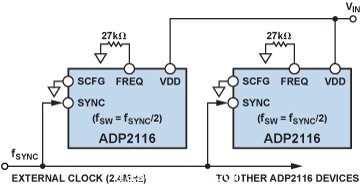 雙通道開關調節器ADP2116 就是可同步器件的一個很好的例子。通過SCFG引腳,可將其SYNC/CLKOUT引腳配置為輸入SYNC引腳或輸出CLKOUT引腳。作為輸入SYNC引腳,它可讓ADP2116與外部時鐘同步,兩個通道以外部時鐘頻率的一半、彼此180°錯相工作。