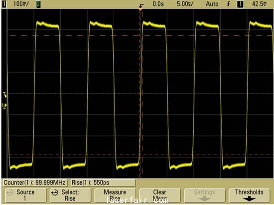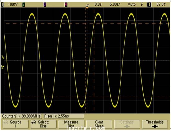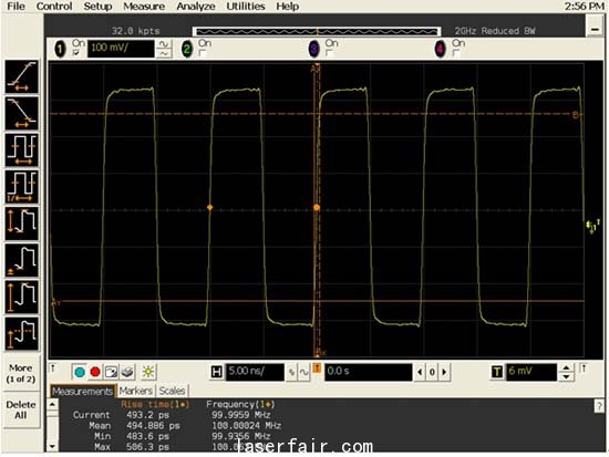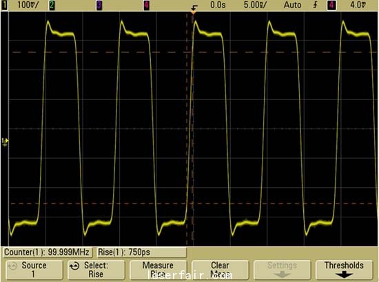 從圖中可以看出,該示波器主要只通過了該時鐘信號的100MHz基本頻率成分,因此,時鐘信號顯示出來大約是正弦波的形狀。帶寬為100MHz的示波器對許多時鐘速率在10MHz 到 20MHz 范圍的基于MCU的8bit設計而言可能非常合適,但對于這里測量的100MHz的時鐘信號就明顯不夠了。 圖4給出了利用Agilent公司500MHz帶寬的示波器MSO6054A測量同一信號的結果。