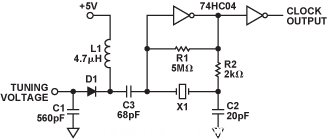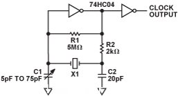IC4是固定頻率金屬帽殼晶體振蕩器。另一種方法是使用CMOS反相器(74HC04)和分立晶體X1來構(gòu)成一個振蕩器,如圖5所示。這種方法使用的元件雖然多于一體式金屬帽殼振蕩器,但它支持通過調(diào)整電容C1來調(diào)節(jié)晶體頻率,從而實現(xiàn)精密的頻率調(diào)諧。