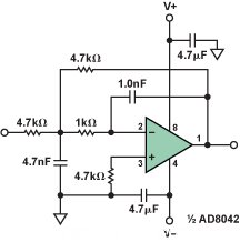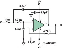 圖7和圖8所示為有源濾波器設計,它們應能很好地代替簡單的無源RC濾波器。圖7顯示的是一個二階Sallen-Key濾波器,轉(zhuǎn)折頻率約為39 kHz,使用標準電阻和電容值。雙通道運算放大器AD8042 和AD822 具有低電源電壓和寬擺幅特性,是很好的選擇。該濾波器在通帶內(nèi)的增益為+1。