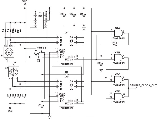 AD783要求一個寬度為150 ns至250 ns的窄正采樣脈沖。為使顯示的波形保持穩(wěn)定,無來回跳動,采樣脈沖必須非常穩(wěn)定,抖動很低。這一要求往往將可能的時鐘選擇限定于晶體振蕩器。另一個要求是采樣速率可以在略低于100 kHz到大約500 kHz的范圍內(nèi)進行調(diào)整或調(diào)諧。為使下采樣信號落在聲卡的20 Hz到20 kHz音頻帶寬內(nèi),采樣頻率間的調(diào)諧步進必須較為精細。一個諸如圖4所示的N分頻電路和一個頻率介于10 MHz到20 MHz的晶體振蕩器(IC4),可以提供從80 kHz到350 kHz的多達200種或更多的不同采樣速率,步進大小介于300 Hz到5 kHz之間。本例使用兩個4位二進制升降計數(shù)器74HC191,N可以是4到256之間的任意整數(shù)。也可以使用74HC190等十進制計數(shù)器,其引腳排列與74HC191相同,可以提供4到100的N值。分頻比利用兩個十六進制開關S1和S2設置。開關S3設置計數(shù)器是遞增還是遞減計數(shù)。電阻R1 (250 Ω)和電容C1 (68 pF)給引腳計數(shù)輸出增加一個很短的延遲,經(jīng)過該延遲后,引腳計數(shù)輸出加載起始計數(shù)值。74HC00的四個NAND門用于實現(xiàn)單穩(wěn)態(tài)模式,當R12為2.7 kΩ且C2為68 pF時,單穩(wěn)態(tài)模式提供200 ns的采樣脈沖。