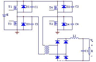 傳統的全橋變換電路開關元件在電壓很高或電流很大的條件下,在門極的控制下開通或關斷,開關過程中電壓、電流均不為零,出現重疊,導致了開關損耗。開關損耗隨開關頻率增加而急劇上升,使電路效率下降,阻礙了開關頻率的提高。在移相控制技術的基礎上,利用功率管的輸出電容和輸出變壓器的漏電感作為諧振元件,使全橋變換器四個開關管依次在零電壓下導通,實現恒頻軟開關。由于減少了開關過程損耗,變換效率可達80%-90%,并且不會發生開關應力過大。所以選用移相控制全橋型零電壓開關脈寬調制(PSC FB ZVS-PWM)變換電路。