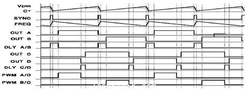 UC3875的核心是相位調制器, 其13腳B輸出信號與14腳A輸出信號反相, 9腳C輸出信號與8腳D輸出信號反相, 這四個驅動信號經擴流后由驅動變壓器去驅動 ~ MOS管。相位控制的特點體現在UC3875的四個輸出端具有相同的驅動脈沖分別驅動A/B、C/D兩個半橋,通過移相錯位控制有源時間,使全橋的四個開關輪流導通。每個輸出級導通前都有一個死區,而且可以調整死區時間。在該死區時間內確保下一個功率開關器件的輸出電容放電完畢,為即將導通的開關器件提供電壓開通條件。因此,每對輸出級(A/B,C/D)的諧振開關作用時間,可以單獨控制。在全橋變換拓撲模式下,移相控制的優點得到最充分的體現。UC3875在電壓模式和電流模式下均可工作,并具有過電流關斷以實現故障的快速保護。圖4為移相控制全橋電路的控制波形。