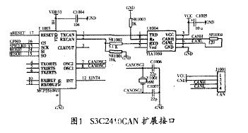 由于S3C2410和S3C44B0不帶CAN接口,所以必須對其進行擴展。S3C2410的CAN 擴展接El如圖1所示,S3CA4B0的CAN接口與其相似。