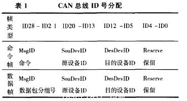 本系統使用CAN控制器MCP2510完成CAN總線幀的發送和接收任務。通信數據分為命令幀和數據幀兩種。通信協議利用了CAN總線的29位擴展標識符保存了一些協議中必要的信息,如表1所示。由于CAN支持多主機和多從機模式,所以為源設備和目的設備地址分配了ID,以區分數據的來源和目的地。數據幀的數據量較大,必須分批傳送,所以標識符里還包含了數據包分組號,用來排序。