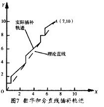 數字積分法插補器的關鍵部件是累加器和被積函數寄存器,每一個坐標方向就需要一個累加器和一個被積函數寄存器。一般情況下,插補開始前,累加器清零,被積函數寄存器分別寄存X和Y ;插補開始后,每來一個累加脈沖△£,被積函數寄存器里的內容在相應的累加器中相加一次,相加后的溢出作為驅動相應坐標軸的進給脈沖Ax(或Ay),而余數仍寄存在累加器中;當脈沖源發出的累加脈沖數m恰好等于被積函數寄存器的容量2 時,溢出的脈沖數等于以脈沖當量為最小單位的終點坐標,刀具運行到終點。數字積分法插補第1象限直線的程序流程圖如圖6所示,插補軌跡如圖7所示。