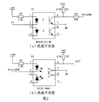 在低速開關量中,由圖2(a)可以看出,這里采用貼片低速光耦MOCD217一M。它是Motorola公司的產品,是具有低輸入電流的雙路光耦。之所以這里在接人輸入口之前加入電阻R3,是因為ARM 中的部分I/0 口是開漏式的,防止在輸入輸出過程中電流過大,將相應口燒壞。如圖2(b)在高速開關量中,采用HC—PL0661雙路光耦進行擴展,它是Agilent Technologies公司的產品,其開關速率可達到1O M左右,可應用于各種高速脈沖輸入輸出的場合。