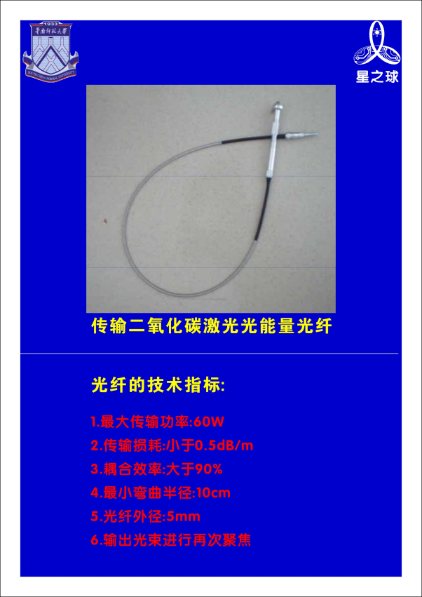 傳輸二氧化碳激光能量光纖是為解決二氧化激光的柔性傳輸,在國(guó)家“863”計(jì)劃項(xiàng)目等的支持下研制成功的高科技產(chǎn)品,并取得了二項(xiàng)省部級(jí)科技發(fā)明二等獎(jiǎng)。該光纖的綜合性能指標(biāo)達(dá)到國(guó)際先進(jìn)水平。傳輸最大功率可達(dá)60W(連續(xù))、柔軟性好(最小彎曲半徑可達(dá)到20cm)、傳輸損耗低(小于0.3dB/m)、光纖外徑(1.0~6.0mm)、光纖長(zhǎng)度(<20m)。可應(yīng)用于二氧化激光雕刻、切割、工藝品加工和二氧化碳激光手術(shù)等,應(yīng)用范圍廣,操作靈活方便。目前,二氧化碳激光的傳導(dǎo)基本上是以機(jī)械導(dǎo)光臂,或?qū)к壱苿?dòng)的鏡片反射式為主,應(yīng)用上具有較大的局限性,難以實(shí)現(xiàn)三維加工,且二氧化碳激光器在工業(yè)激光加工和激光手術(shù)方面占有巨大的市場(chǎng),每年達(dá)到數(shù)百億的產(chǎn)值,因此傳輸二氧化碳激光能量光纖作為二氧化碳激光器的配套產(chǎn)品,可擴(kuò)展了二氧化碳激光器的應(yīng)用領(lǐng)域,為二氧化碳激光器實(shí)現(xiàn)多功能化和智能化創(chuàng)造了廣闊的發(fā)展空間。