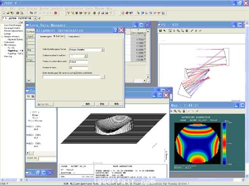 CODE V擁有世界上最先進、最完整的公差分析子程序,可以針對均方根波像差、衍射傳函、主光線畸變或用戶定義的評價指標進行公差分配。在公差計算中可以使用像面位移、傾斜、墊圈厚度等各種補償參教來模擬系統裝校過程中的調整。同時,提供了與Zygo或Wyko干涉儀的接口。如果與上述干涉儀聯用,可以實現對復雜光學系統的計算機輔助實時裝調。其它與系統制造有關的功能包括自動對樣板、國際標準和中國國標加工圖紙繪制、成本估算等。上圖為光學系統的計算機輔助實時裝調。