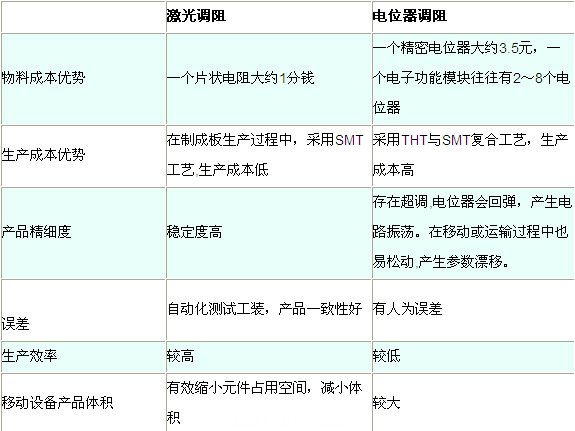 表1:激光調阻VS 精密電位器調阻