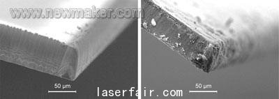 圖1:利用飛秒激光器在高掃描速度下切割晶圓,切割效果因掃描速度的不同而不同。左、右兩張圖分別是以4m/s和80mm/s的掃描速度切割晶圓的效果圖,很顯然,掃描速度越高,切割效果越好。