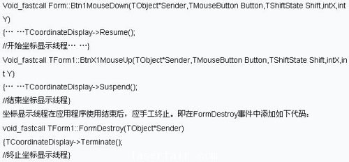 在創(chuàng)建的代碼中Execute()函數(shù)就是要在線程中實(shí)現(xiàn)的任務(wù)的代碼所在處。在原Unit1.cpp代碼中包含了CoordinateDisplayThread.h文件。使用時(shí),動(dòng)態(tài)創(chuàng)建一個(gè)TCoordinateDisplay對(duì)象,具體執(zhí)行的代碼就是Execute()方法重載的代碼。