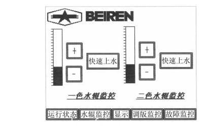 在人機(jī)界面中,設(shè)計(jì)了7幅畫(huà)面,包括整體圖形,故障顯示,機(jī)器速度和計(jì)數(shù)顯示,水輥速度顯示,調(diào)版監(jiān)控等。故障顯示使用指示器,給出位元件即可實(shí)現(xiàn)閃動(dòng)效果,讓操作者很方便的知道故障部位,整體感很好。在水輥速度顯示中,設(shè)計(jì)了一個(gè)柱狀圖,可以顯示水量增加大小,只需按下柱狀圖,就可增加水量,同時(shí)也可方便監(jiān)控。如圖所示:
