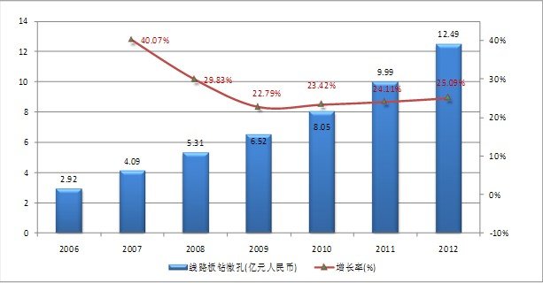 CPCA(中國印刷電路行業(yè)協(xié)會)統(tǒng)計,2006年至2008年國內(nèi)HDI市場成長速度達30%以上,2006年中國HDI使用面積達到285萬平方米。根據(jù)HDI平均每平方米232500孔,每千孔加工價格0.80元,外包比例55%測算,2006年HDI鉆孔外包市場規(guī)模達到2.92億元,2007年增長40%,達到4.09億元,2008年增長30%,市場規(guī)模為5.31億元。預(yù)計2009年市場規(guī)模為6.52億元,至2012年市場規(guī)模為12.49億元。以下是中國線路板鉆微孔的市場容量預(yù)測: