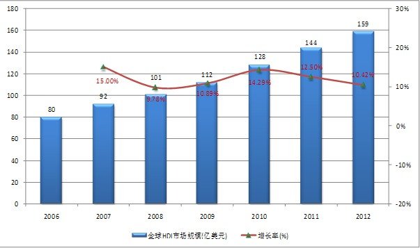 2009年全球HDI應(yīng)用分布 數(shù)據(jù)來源:臺灣工研院IEK 根據(jù)臺灣工研院IEK 統(tǒng)計數(shù)據(jù),2007年HDI板全球市場規(guī)模增長15%達到92億美元,2008年達到101億美元,2006-2008年年復(fù)合成長約13.5%,預(yù)計到2009年將達到112億美元,未來幾年仍可保持10%以上的增長速度。 全球HDI市場規(guī)模走勢圖 (億美元) 數(shù)據(jù)來源:臺灣工研院IEK