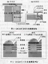 JFET傳感器像素選擇開關由3個晶體管組成:轉移、JFET和復位。而CMOS傳感器則由4個晶體管組成,第4個晶體管用做像素選擇。因此LBCAST有著比CMOS簡單的結構,較高的效率,并且因為單位面積的光電二極管可以增加,也就提高了其功能性。內部連線(包括非透明層)結構也很簡單,適合于一個多晶硅層和2個材料層。而CMOS在組成上的設計卻包括四層。需要的層數越少,光電二極管與微透鏡的距離就越短,通過BPD(Burie d PhotoDiode)、內部FPN(Fixed Pattern Noise)等技術,LBCCAST傳感器可有效降低暗光線下拍攝的圖像噪聲。它類似于CMOS的雙通道讀取方式可提高數據讀出速率,非常貼近光敏單元的微透鏡在提高光效率同時有效改善了畫面中央和邊角的一致性。LBCAST JFET像素結構圖如圖3所示,LBCAST JFET像素剖面圖如圖4所示。