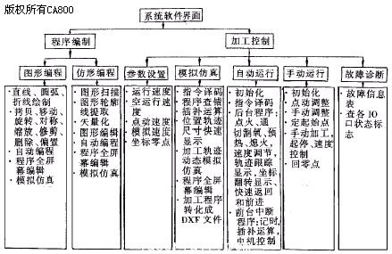 該系統軟件提供的編程方式有三種:圖形編程,仿形編程,手工編程。手工編程只是圖形編程和仿形編程中的一個功能模塊,即全屏幕程序編輯,所以沒有在軟件框圖中單列。