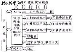 數控火焰切割機機械部分主要由底座、龍門式移動框架、火焰噴頭、傳動機構和三個步進電機組成(圖略),以實現對平面板材零件的切割加工。三個步進電機分別控制龍門框架的前后移動(Y電機)、火焰噴頭的左右(X電機)和上下移動(Z電機),X、Y、Z三軸可以實現聯動控制。數控系統的硬件結構如圖1所示。該控制系統以IPC(486以上CPU,8MB以上內存,500MB以上硬盤)作為主機,除了IPC的固有硬件(CPU主板、TVGA卡、電源),只在插槽中增加了一塊32位光隔離I/O.TIMER(并行輸入輸出/定時器)卡。由該卡的I/O并行口控制三個步進電機的運行、乙炔開關、乙炔點火、切割氧開關以及接收工作臺的限位行程開關信號、坐標零位信號。由板上的8253定時器作為步進電機運行中斷服務程序的中斷定時器,時鐘頻率取2MHz。通過計算機的鍵盤實現對控制系統的操作。三個移動方向步進電機的脈沖當量均為0.01mm。由于486以上PC機高的運行速度,完全可以用一個CPU完成從系統程序管理到加工控制的所有工作,沒有必要采用上、下位機的多CPU結構。