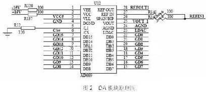 數模轉換模塊將DSP處理完的數字信號轉換為模擬信號以控制兩路振鏡的偏轉。由于現在對標記精度的要求越來越高,傳統的8位數模轉換器已無法滿足用戶的需求,因此本系統選用ADI公司的16位高精度數模轉換器AD669芯片,如圖2所示。AD669為16位并行輸入,二級數據緩存結構。設計中將/L1信號直接接地設置為有效,通過控制/CS和LDAC信號分別控制一級緩存和二級緩存。控制振鏡信號的電壓范圍為-10V~+10V,以標記 100mm×100mm幅面大小的標牌為例,精度可達100mm/216=0.0015mm,對應最小輸出電壓為0.00031V。