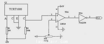 紅外光電傳感器TCRT1000,它是一種光電子掃描,光電二極管發射,三極管接收并輸出的裝置 .它的特點是尺寸小、使用方便、信號高輸出、工作狀態受溫度影響小。它的外圍電路簡單,(如圖3所示)。二極管的C端和三極管的E端接地,二極管的A端通過一電阻和電源相接,組成偏置電流電路;三極管的C端也通過一電阻和電源相接,組成輸出電路。當檢測器檢測到白色時,其輸出低電平;當檢測到黑色時,則輸出高電平。