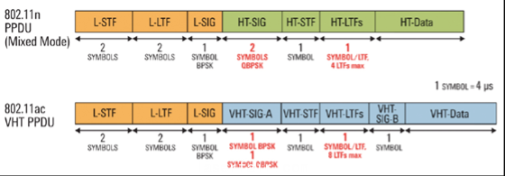 圖2. 802.11n 與802.11ac的幀結(jié)構(gòu)的對(duì)比