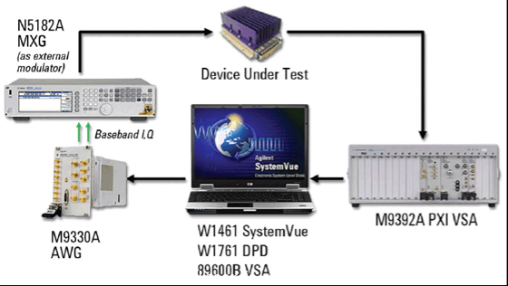 另一個(gè)測(cè)量挑戰(zhàn)出現(xiàn)在測(cè)量數(shù)字預(yù)失真(DPD),為了改善失真,需要產(chǎn)生和測(cè)量占用帶寬高出3-5倍帶寬范圍內(nèi)的功率放大器的線性特征。安捷倫SystemVue W1716 DPD Builder軟件能夠提供一個(gè)自動(dòng)數(shù)字線性失真設(shè)計(jì)測(cè)試應(yīng)用。該軟件產(chǎn)生一個(gè)激勵(lì)波形,下載到信號(hào)源,信號(hào)源產(chǎn)生的信號(hào)通過功率放大器后使用信號(hào)分析儀接受放大后的信號(hào),并將信號(hào)解調(diào)出來,傳輸給測(cè)試電腦,軟件通過對(duì)比激勵(lì)波形和接收到的波形判斷失真情況,從而達(dá)到測(cè)量和分析功能。如下圖: