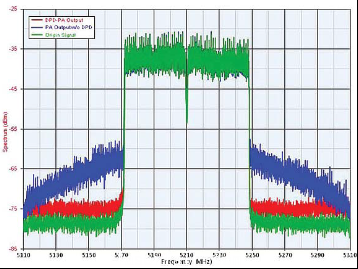 圖4顯示了一個(gè)802.11ac 80MHz信號(hào)經(jīng)過預(yù)失真的實(shí)例。綠色波形是發(fā)射的激勵(lì)信號(hào),藍(lán)色波形是沒有經(jīng)過預(yù)失真處理的從功放輸出的信號(hào),而紅色波形是經(jīng)過預(yù)失真的結(jié)果。
