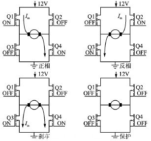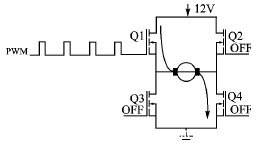 驅動有刷直流電機的雙向旋轉,可通過全橋驅動電路改變電流來實現完成,如圖2所示。這個全橋驅動電路由N通道的MOSFET管組成,當Q2和Q3關閉的時候,Q1和Q4導通電機正相旋轉;當Q1和Q4關閉時,Q2和Q3導通電機反相旋轉。
