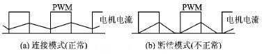 設計選用150 W MAXON RE40電機。在12 V輸入下,無負載的速度是6 920 r/s。最大連續電流是6 A。PWM時基信號對電機噪聲有很大的影響(因為人耳一般能聽到的聲波的頻率范圍是20 Hz~20 kHz),同時影響電機的表現性能。要防止整個周期中電流過零(就是通常所說的不連續的電流狀態,當電機輕載時),如圖5(b)所示。這種不連續電流會導致扭矩轉速曲線非常陡,在電機中將產生某種脈沖,使電機轉子產生更大的噪聲,本電路使用MAXON電機,就是為了獲得連續的電流模式,所選擇的PWM脈沖頻率是8 kHz。