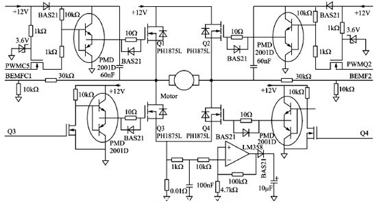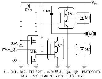 MOSFET驅動提升了控制器輸出信號驅動電機的能力。本設計選擇NXP芯片PMD2001D和PMGD280UN,如圖7所示。