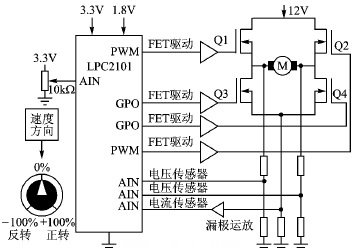 PWM信號(Q1和Q2)根據LPC2101微控制器定時器2的3個匹配寄存器決定信號的時基頻率。電機速度(占空比)和方向通過調整電位器輸入及改變LPC2101 ADC的輸入數值來控制,如圖4所示。