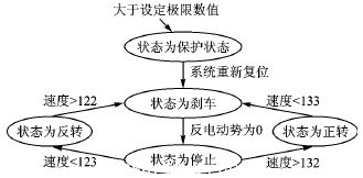 軟件部分采用C語言編寫,使用Keil μVision(ARM7 RealView V3.0)開發環境。主函數實現如下功能:讀取電位器數值來調整速度和電機方向;讀取電機反電動勢電流;設定PWM占空比和控制Q1~Q4 MOSFET輸出;執行RS232通信。圖11表示控制系統流程。使用 RS232接口每200 ms給PC端計算機發送電機速度和電流、電壓信息。電機控制軟件部分狀態機如圖12所示。狀態處理是在主程序循環中處理的,LPC2101的定時器2用于產生PWM信號。在每個PWM信號中斷子程序進入后,可以通過改變占空比來調整既定電機速度并設置MOSFET輸出控制 Q1~Q4。定時器0用于10 ms的系統定時。
