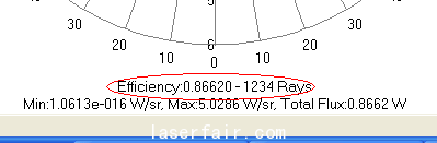由此可見:該光學(xué)系統(tǒng)中有41.88%的光是直接照射,不需經(jīng)過光學(xué)系統(tǒng),即能量損失為0,另有58.12%的光需要經(jīng)過反射壁反射,反射效率取決于反射壁材料及加工工藝。通過鍍?cè)鰪?qiáng)鋁膜或者銀模,反射效率可以達(dá)到90%以上,因此反光系統(tǒng)效率可以達(dá)到并超過以下數(shù)值: