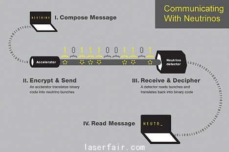 研究過程中,科學家將信息編碼成微中子束(微中子是一種微小的亞原子粒子)而后發射并穿過240米厚的巖石。第一條使用這項技術發送的信息非常簡單,就是“微中子”。這項通信技術雖然先進,但也存在缺陷,目前唯一具備發射這種微中子束能力的設備就只有一臺2.5英里(約合4023米)長的粒子加速器。接收裝置是一臺巨大的地下粒子探測器,重達數噸。