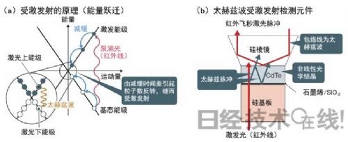 日本東北大學尾辻研究室證實的、石墨烯受激發射出太赫茲波的原理(a),以及評測用元件的構造(b)。(a)為4能級系統的受激發射。(b )CdTe起非線性光學結晶作用。本圖由《日經電子》根據尾辻研究室的資料制成。