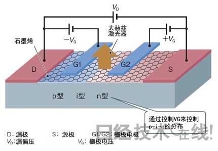 日本東北大學尾辻研究室設想的電流注入型石墨烯激光元件的構造。其思路是:在利用電氣方式實現p-i-n結的狀態下施加漏偏壓(VD),這時就會發生粒子數反轉狀態,從而形成激光振蕩。