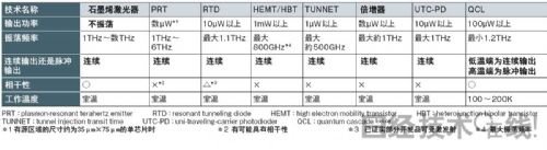 太赫茲波是指頻率在100G~10THz范圍內的電磁波。通過利用太赫茲波,除了能夠實現數據傳輸速度為100Gbit/秒的超高速無線數據傳輸,以及透視信封鑒定內裝藥物的安全用途之外,還有望實現識別癌細胞等醫療應用。瞄準這些應用,業內還積極利用多項關鍵技術對太赫茲波源展開了開展(表1)。