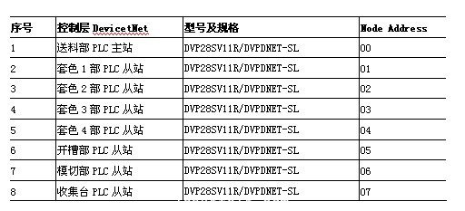 由于版面原因,編碼器數量不能全部標示出來。另外,各個機構的位置調整,只是在更換生產料號時才動作,因此客戶為了節省成本,每個機臺只安裝2臺變頻器作調速定位,依靠外部接觸器切換各個機構的電機工作,因此每次最多只有2個位置調整機構同時動作。人機界面通過Ethernet網絡,先訪問DeviceNet控制層的主站送料部PLC,再通過DeviceNet網絡訪問到各個從站PLC。每一個機臺的2個PLC通過RS485的PLC-Link方式交換數據。地址(Node Address)分配如表2、3所示。