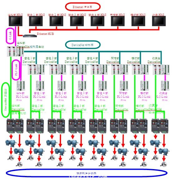 由于設備層是各自PLC站點下屬的獨立網絡,因此可以定義相同的節點地址也不會產生干涉,反而方便編程(例如,套色1到套色4機構相同,都可以使用相同的PLC程序)。