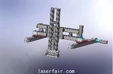 根據用戶對機器人強度高,負載大,運動精度高等要求及人工裝卸零件的方便性和光路要求,我們設計了兩款五軸連動機器人。它們的結構原理上相同,主要由一個龍門式三軸直角坐標機器人和兩個轉動軸組成。由于負載重,直角坐標機器人的Z軸采用了如圖2所示的雙Z軸滾珠絲桿同步驅動。