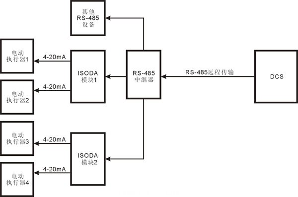 采用模擬信號輸入的電動執行器大多數采用4-20mA的電流信號來控制。利用一個ISODA O1-485模塊可以輸出兩路4-20mA模塊,可以控制兩個電動執行器。ISODA模塊可以和其他智能設備掛在同一個RS-485總線上,在遠程控制中,還可以節約布線成本。下圖為ISO DAO模塊遠程控制電動執行器的一個應用方案。